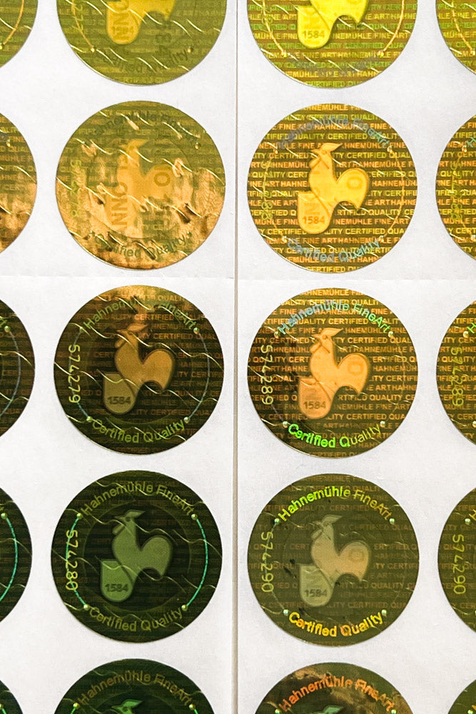 This is achieved by initially preparing a paper based Certificate of Authenticity, detailing the artists name, the year it was produced, the specific paper and inks used, as well as dimensions and if the print is a limited edition, the edition number and size. This certificate is prepared on deckle edged mould made paper that contains a watermark and fluorescent security fibres. A numbered hologram is then attached to the paper.